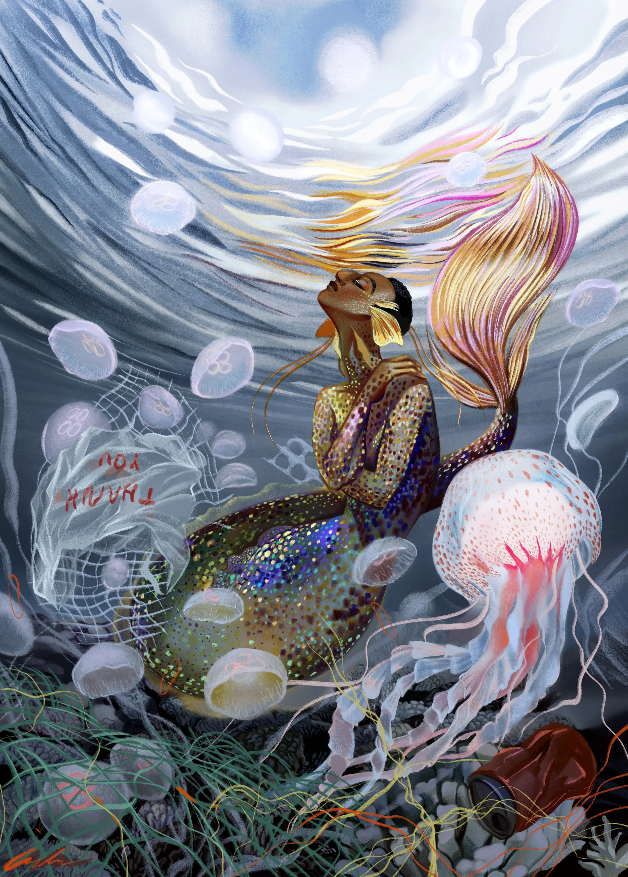 Cover illustration for Mermaids Monthly’s 9th issue, with the theme of climate change. Nominated for a Hugo award in March 2022.